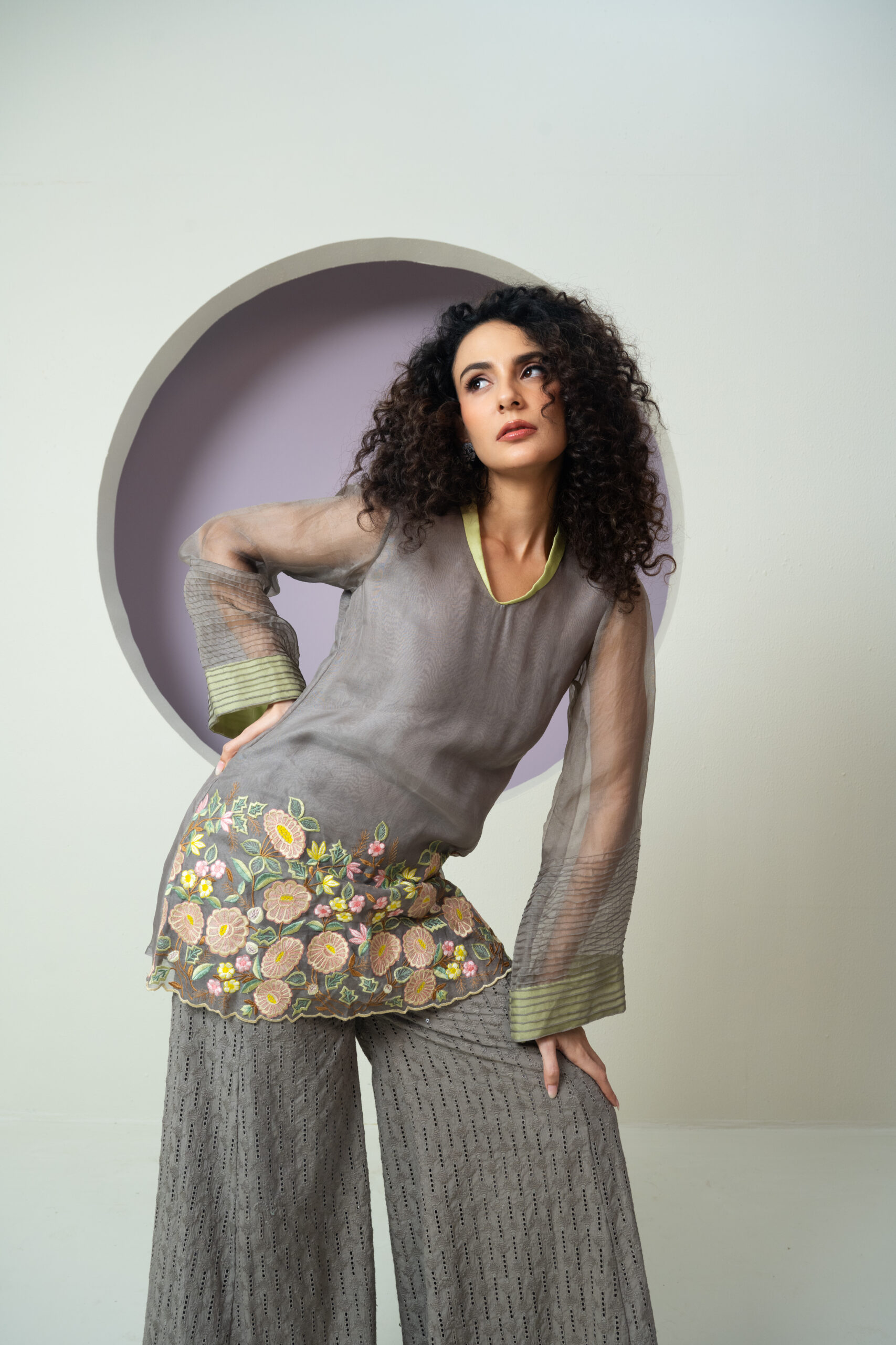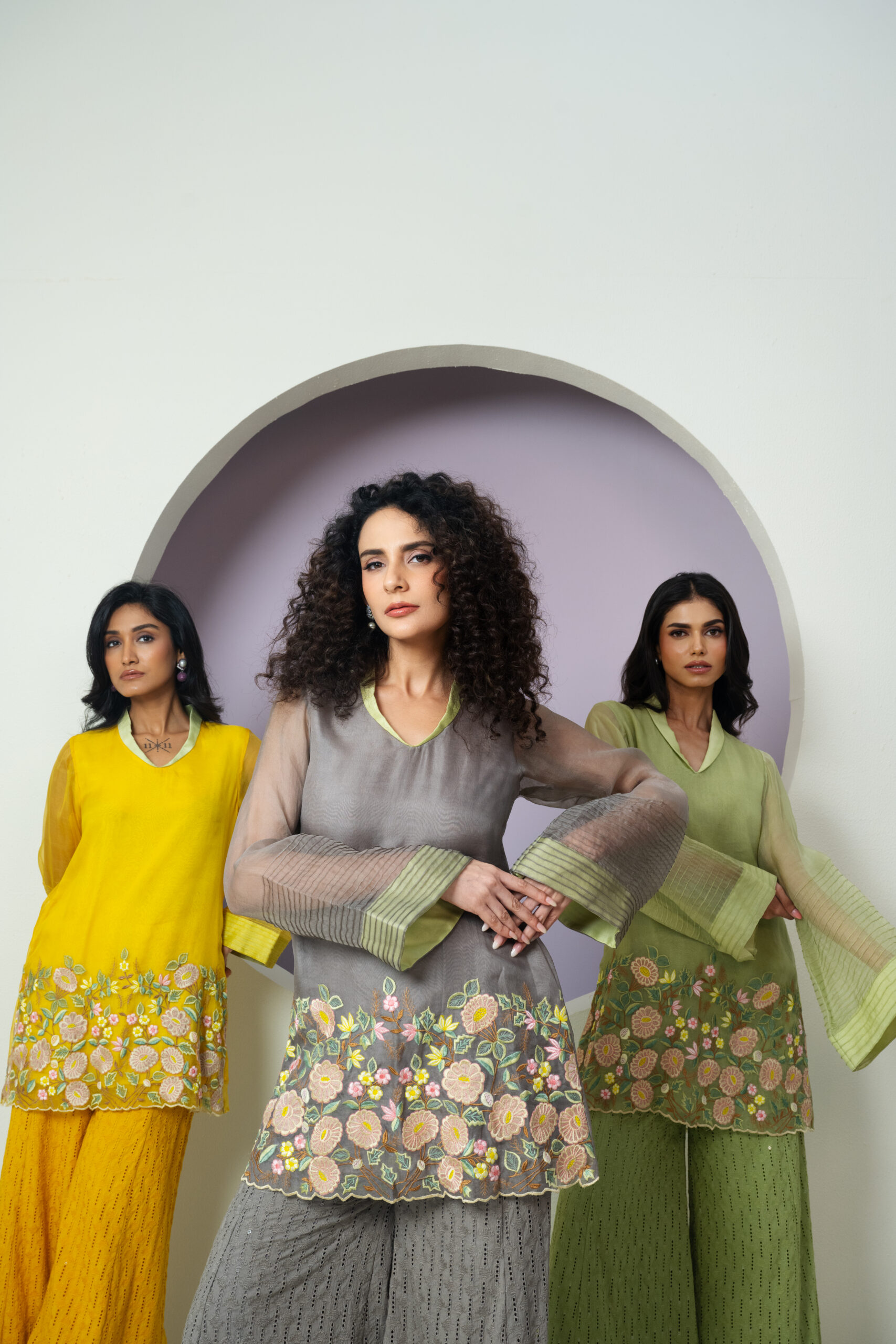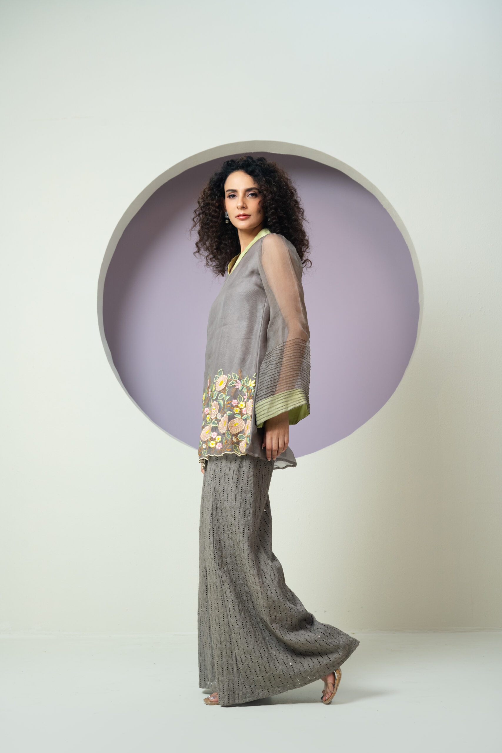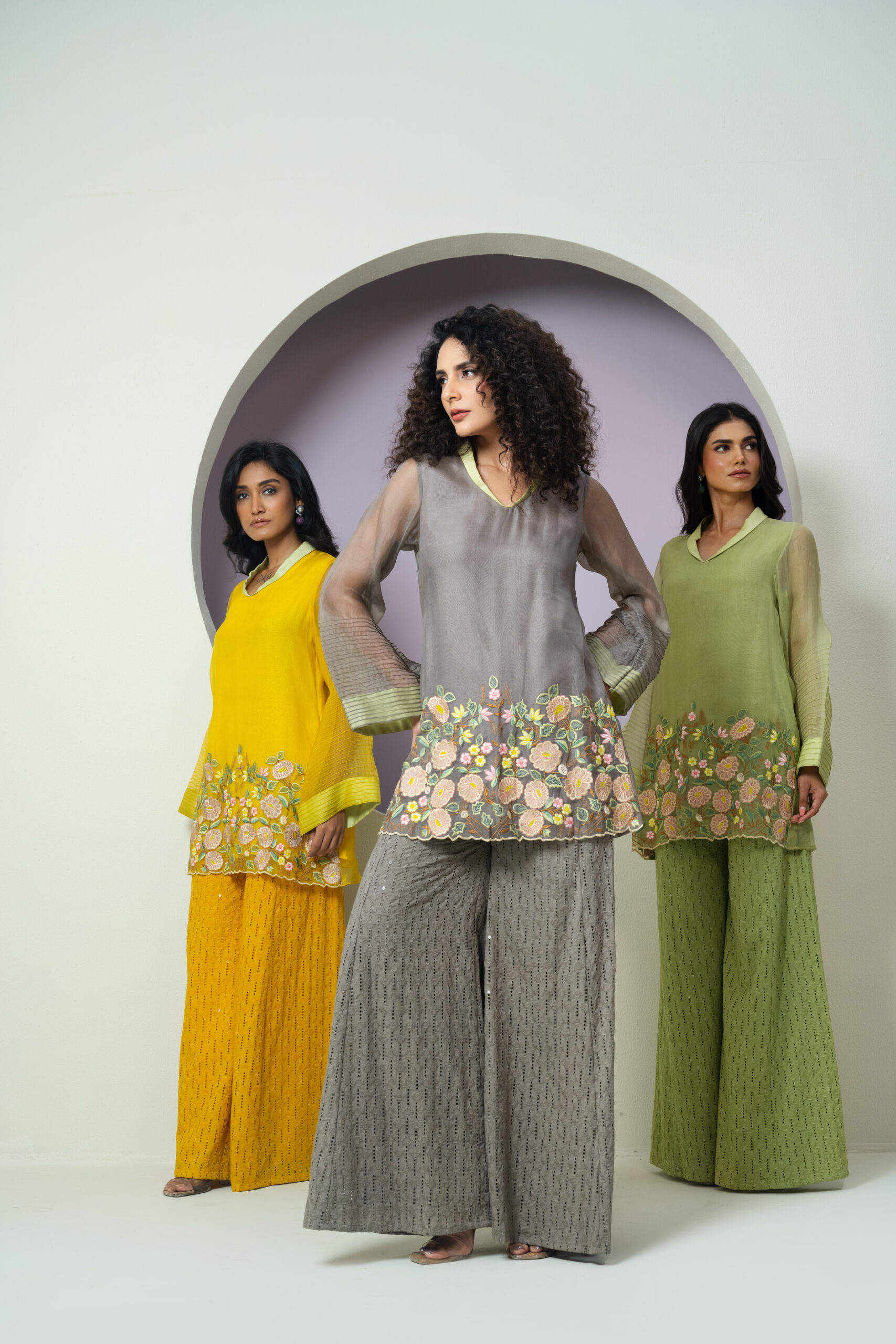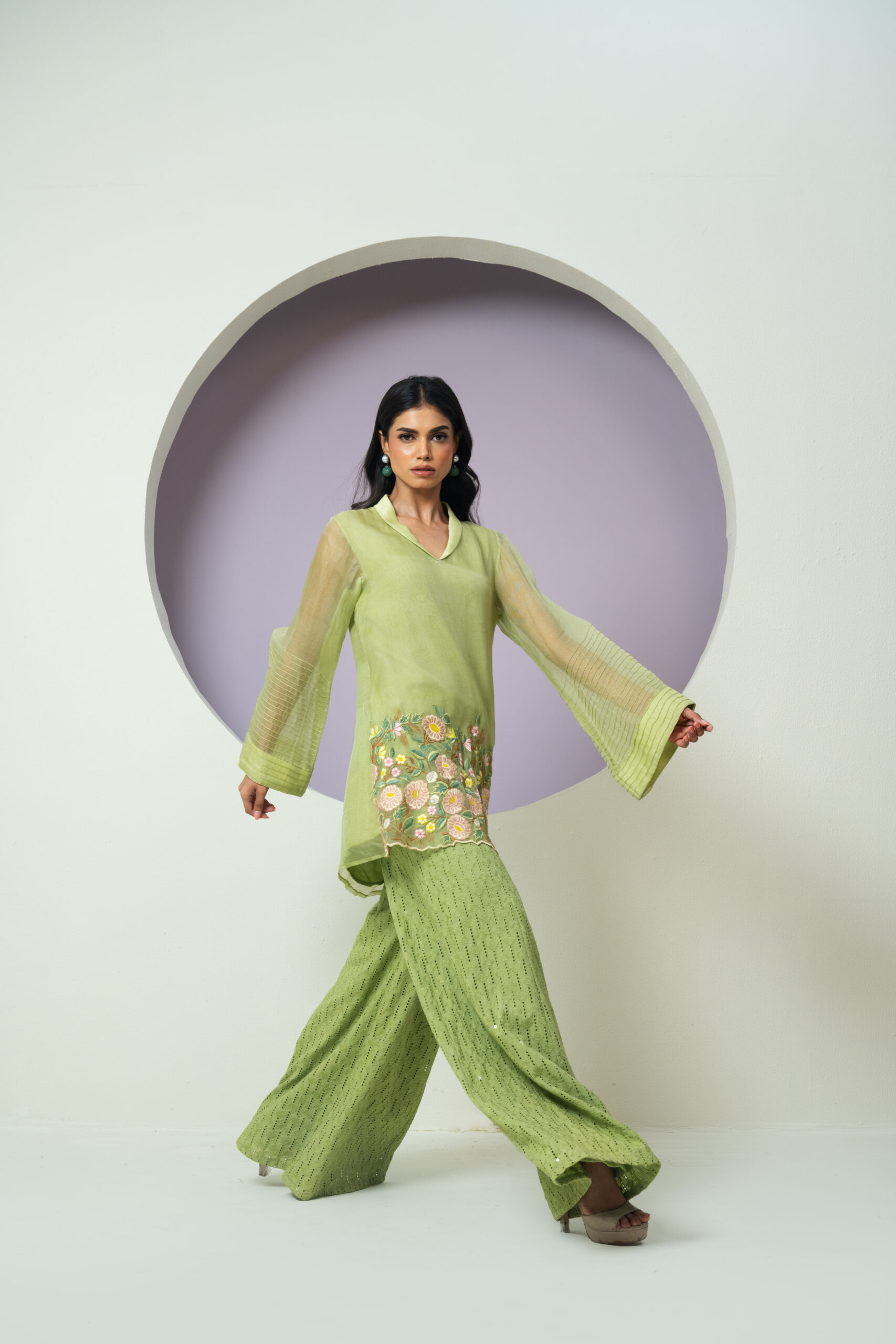 PURE ORGANZA COORDINATE SETS WITH THREAD WORK EMBROIDERY WITH BELL SLEEVES AND BELL BOTTOM PANTS
