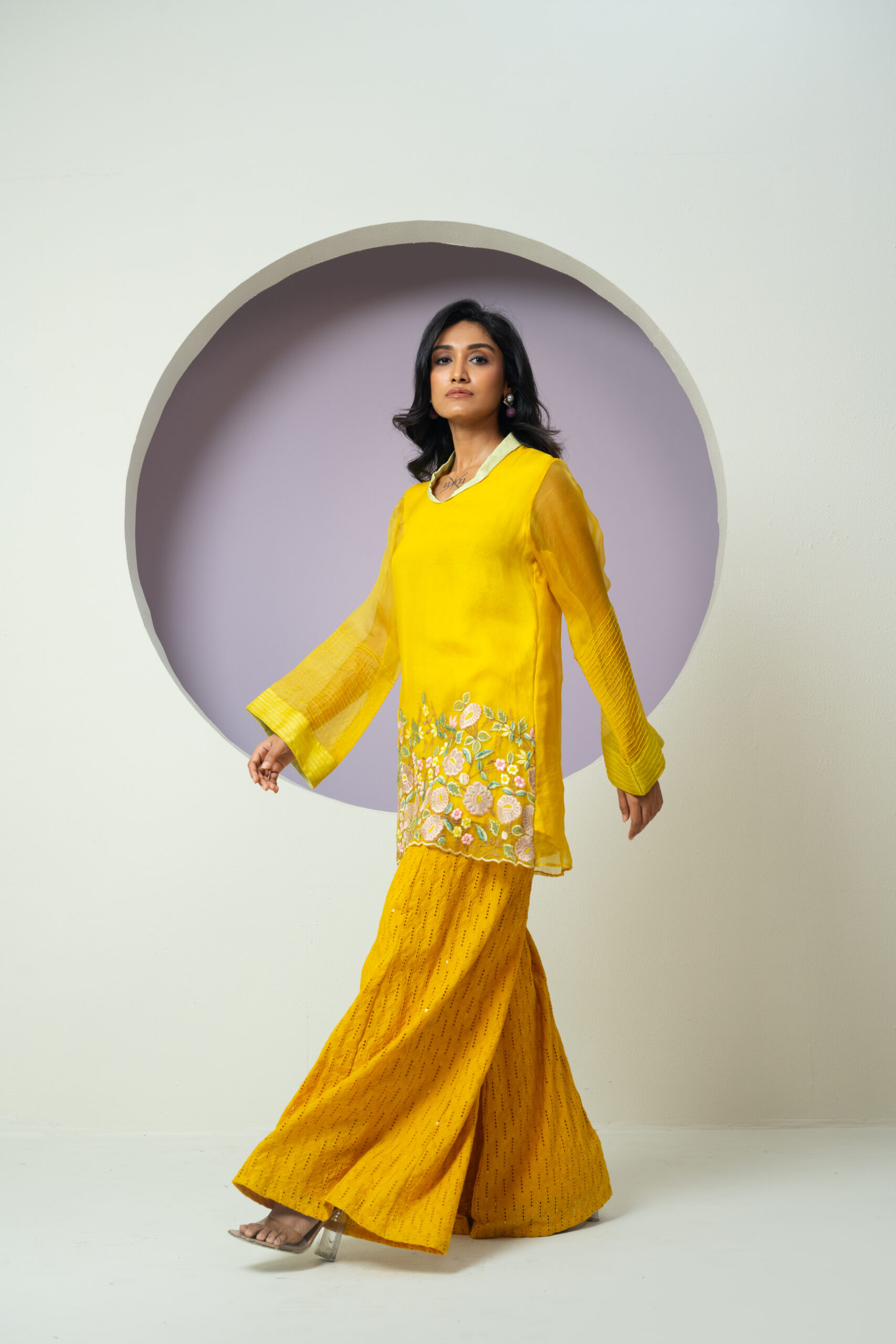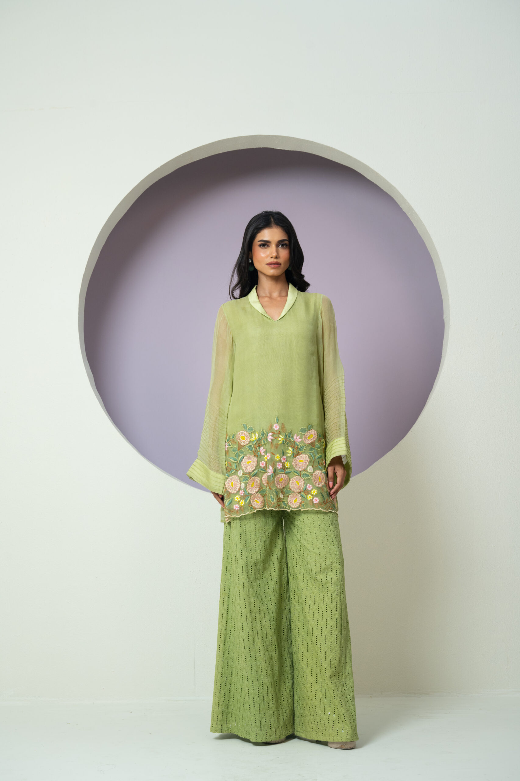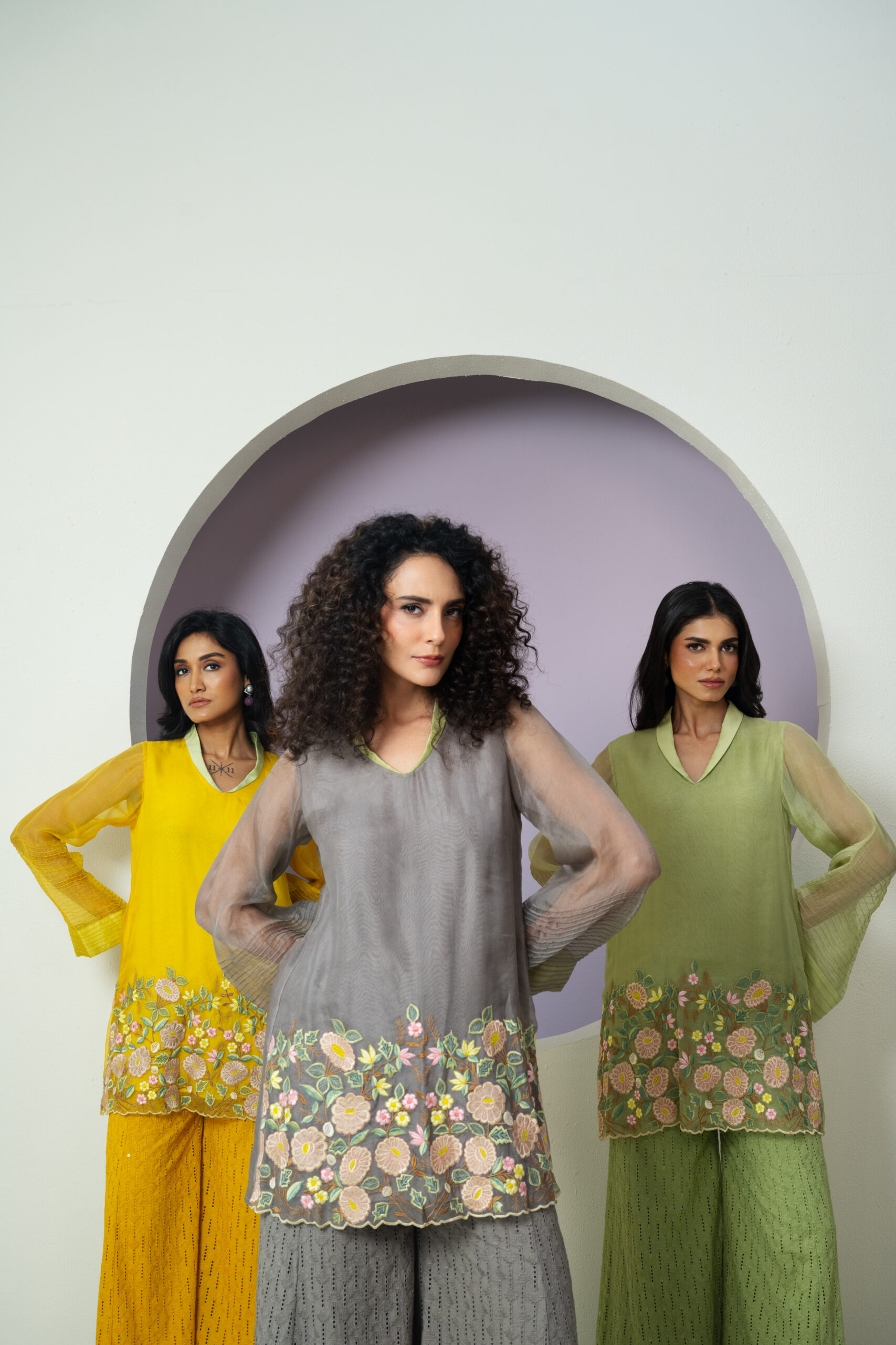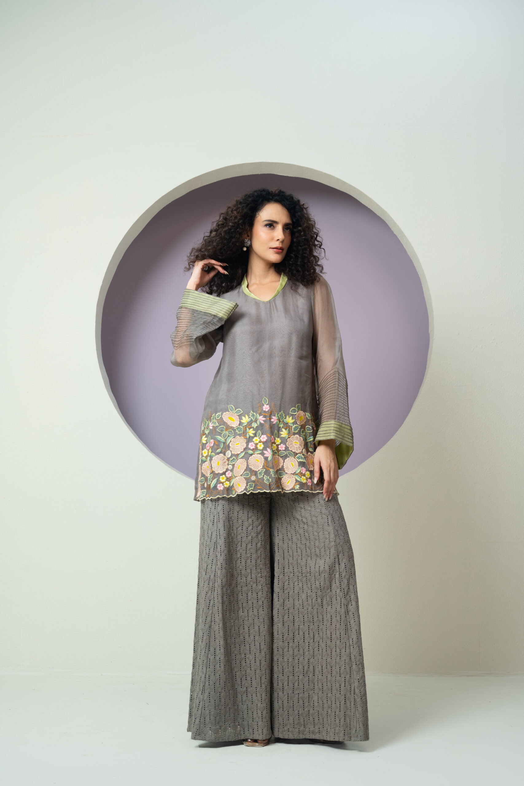 PURE ORGANZA COORDINATE SETS WITH THREAD WORK EMBROIDERY WITH BELL SLEEVES AND BELL BOTTOM PANTS