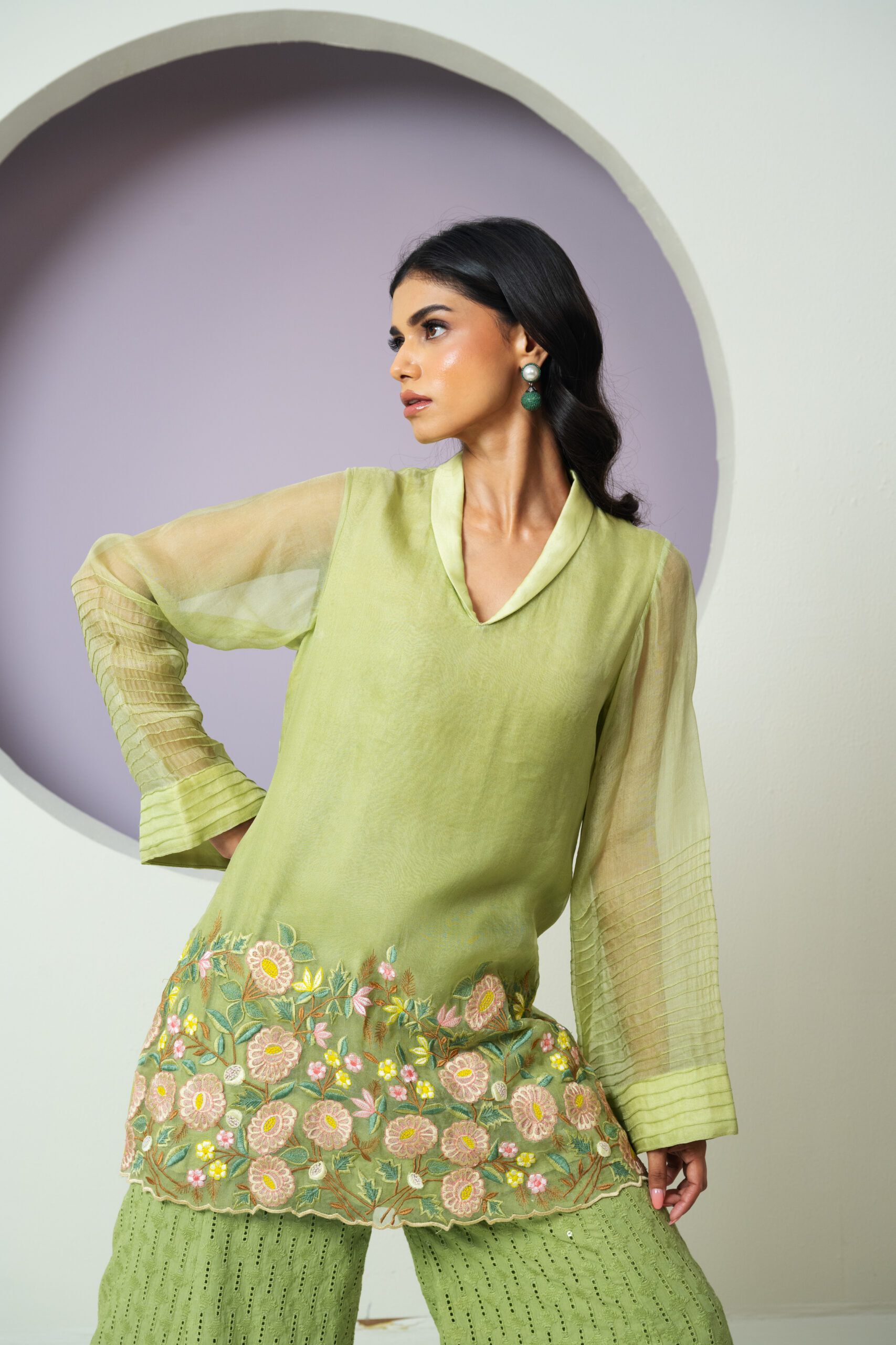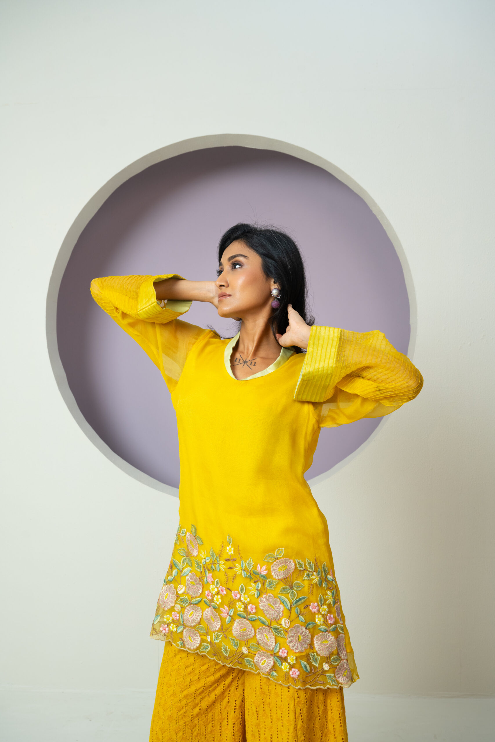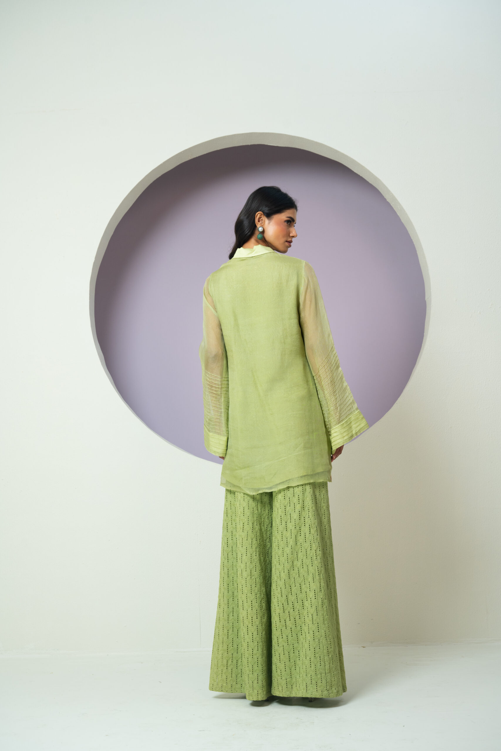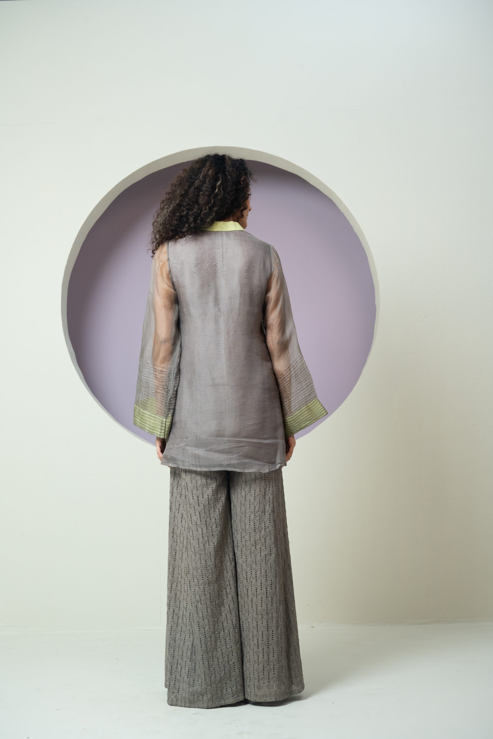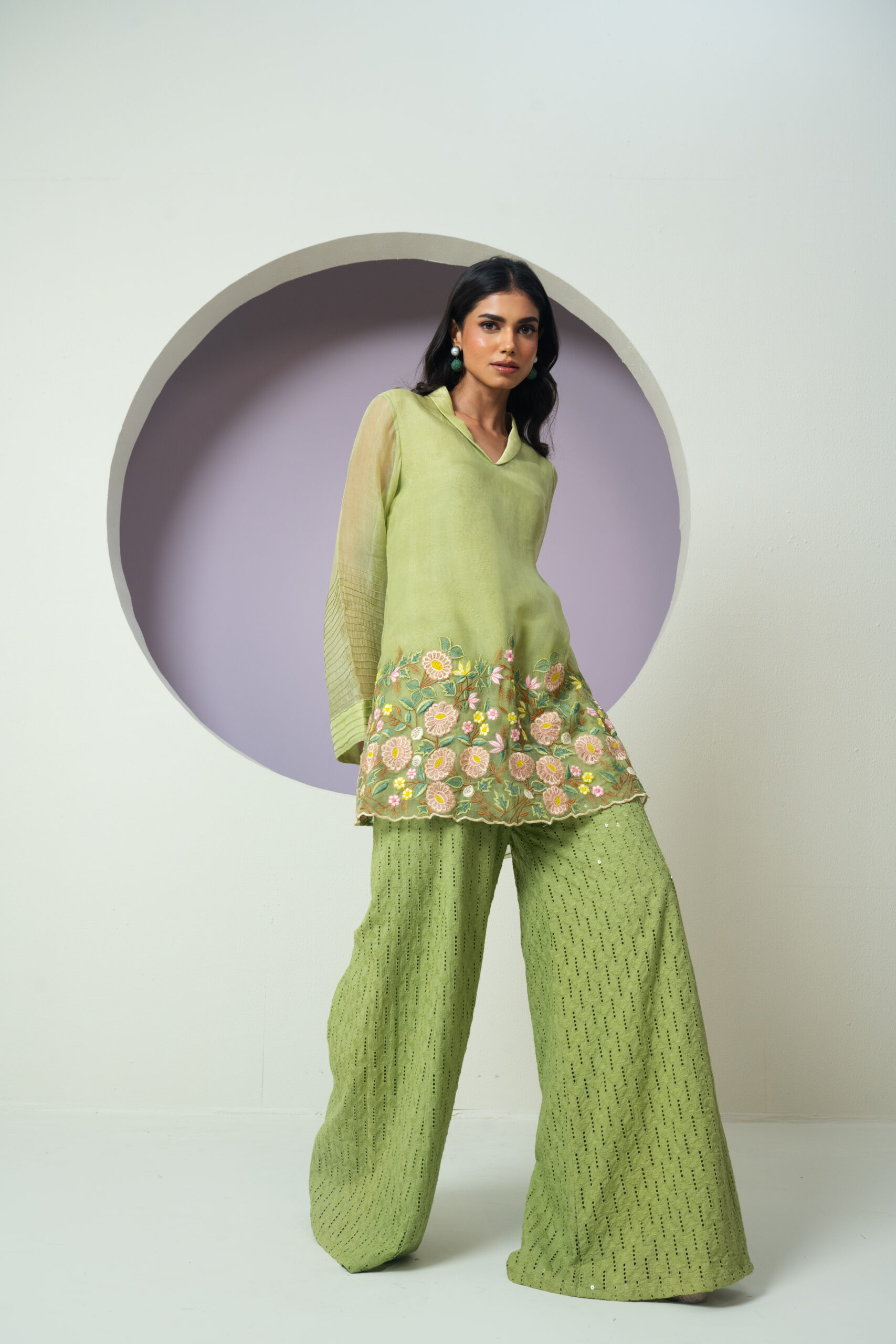 PURE ORGANZA COORDINATE SETS WITH THREAD WORK EMBROIDERY WITH BELL SLEEVES AND BELL BOTTOM PANTS