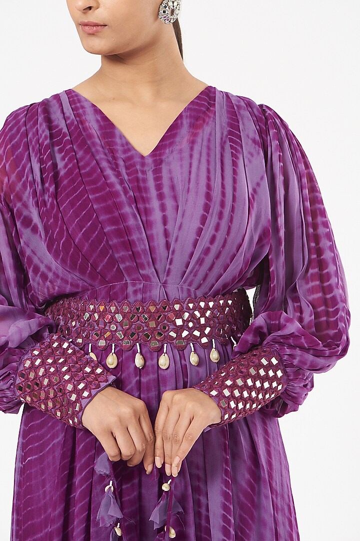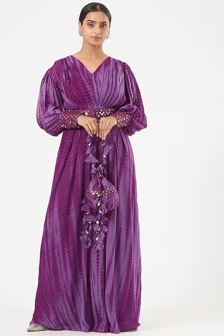 EASY BREEZY PUFF SLEEVED GOWN TEAMED WITH AN INTRICATELY HANDCRAFTED BELT AND MATCHING POTLI. ACCENTUATED WITH A BEAUTIFUL MIRROR WORKED DUPPATTA AND SHELLS